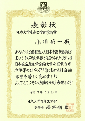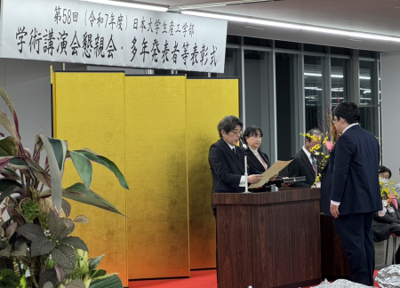 12月13日に開催された生産工学部学術講演会懇親会において、日本大学生産工学部学術賞の授賞式が開催されました。本年5月に受賞した日本表面真空学会論文賞に対し、生産工学部学術賞として表彰頂きました。